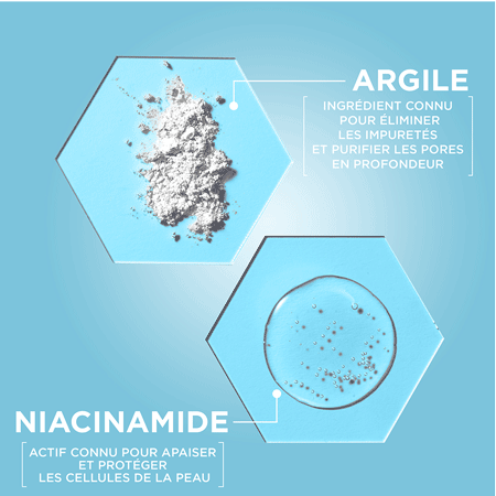 Enrichi en NIACINAMIDE, et en ARGILE, le 3 EN 1 Argile réduit les imperfections et les pores en 1 semaine* pour une peau purifiée et un teint plus uniforme.